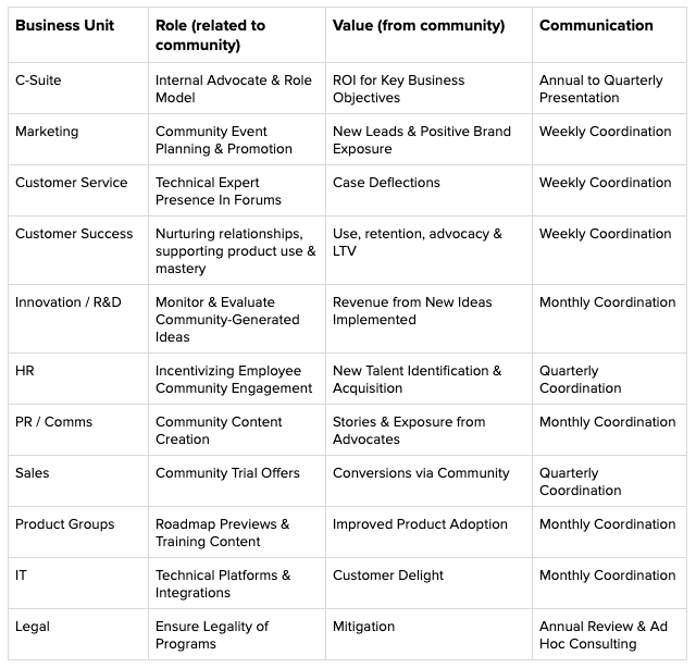 To further illustrate the concept of value exchange among community and other teams, we’ve documented the role each business unit can play with respect to community, what they can expect in return, and how to keep them in the loop on community initiatives.